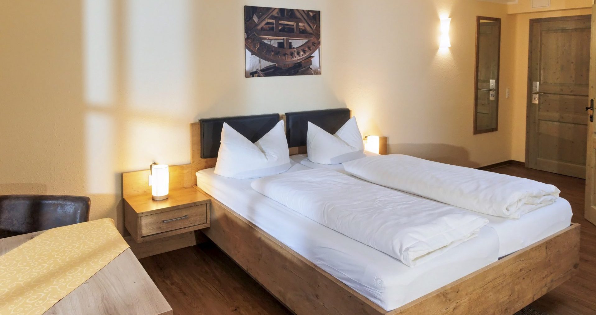 In unserer Landhauspension stehen gemütlich eingerichtete Doppel- und Mehrbettzimmer für Ihren Besuch bereit. Die Räumlichkeiten sind ausgestattet mit WC, Dusche, Flachbildfernseher, Kühlschrank und WLAN.